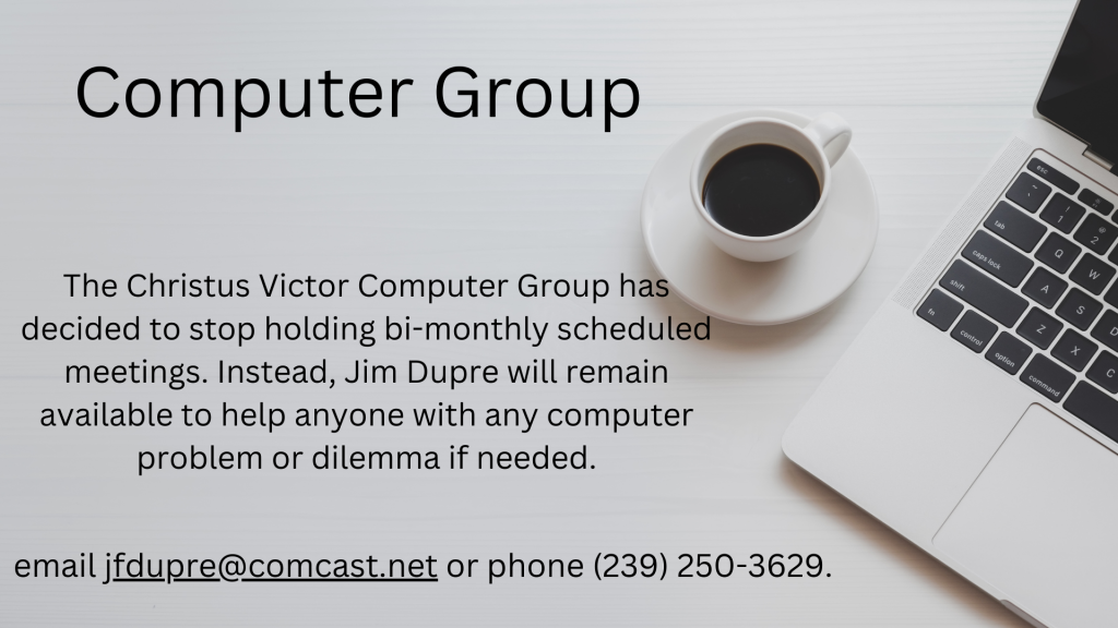 The Christus Victor Computer Group has decided to stop holding bi-monthly scheduled meetings, Instead, Jim Dupre will remain available ...