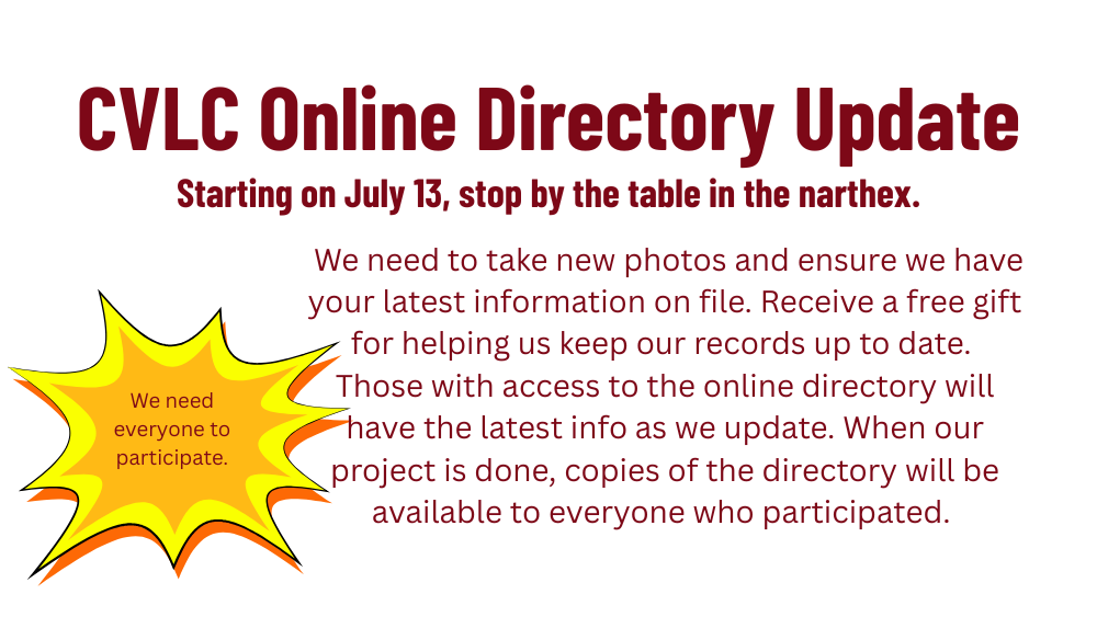 Sign Up to receive information about CVLC's many exciting ministries. You will get the Weekly Email Update each Friday morning and other timely messages throughout the week. It is the best way to keep current with what is happening at CVLC.