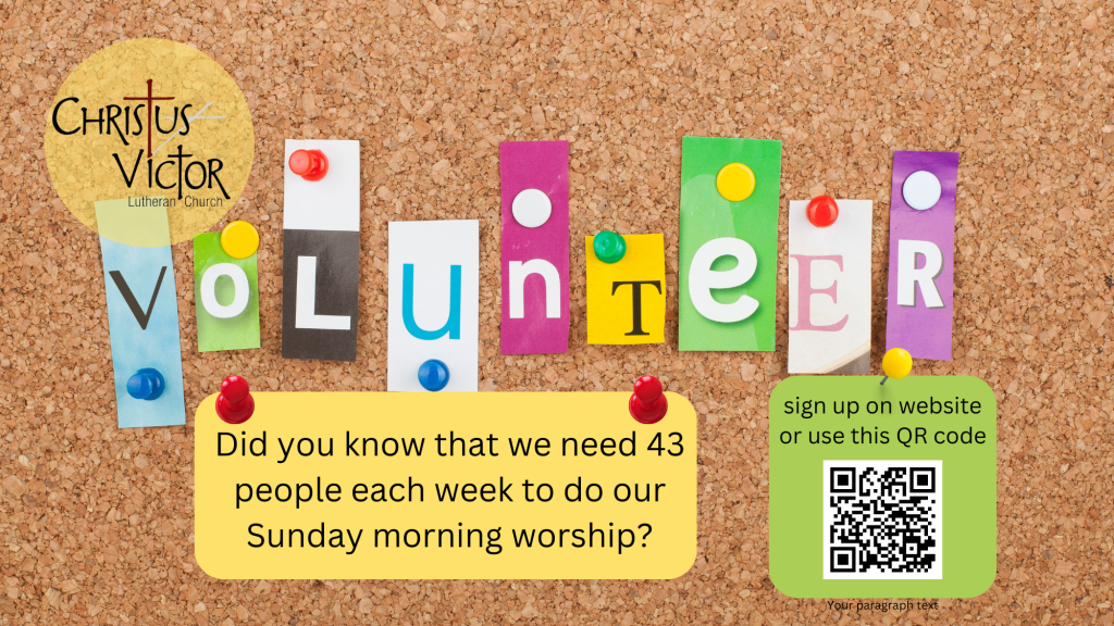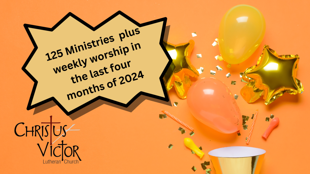 Our mission at Christus Victor is: “sharing God’s love and grace through worship, outreach and fellowship”. It begins in worship, where we share and rejoice in hearing God’s saving Word and celebrate the Sacraments, and it continues as we bring that faith into the world.