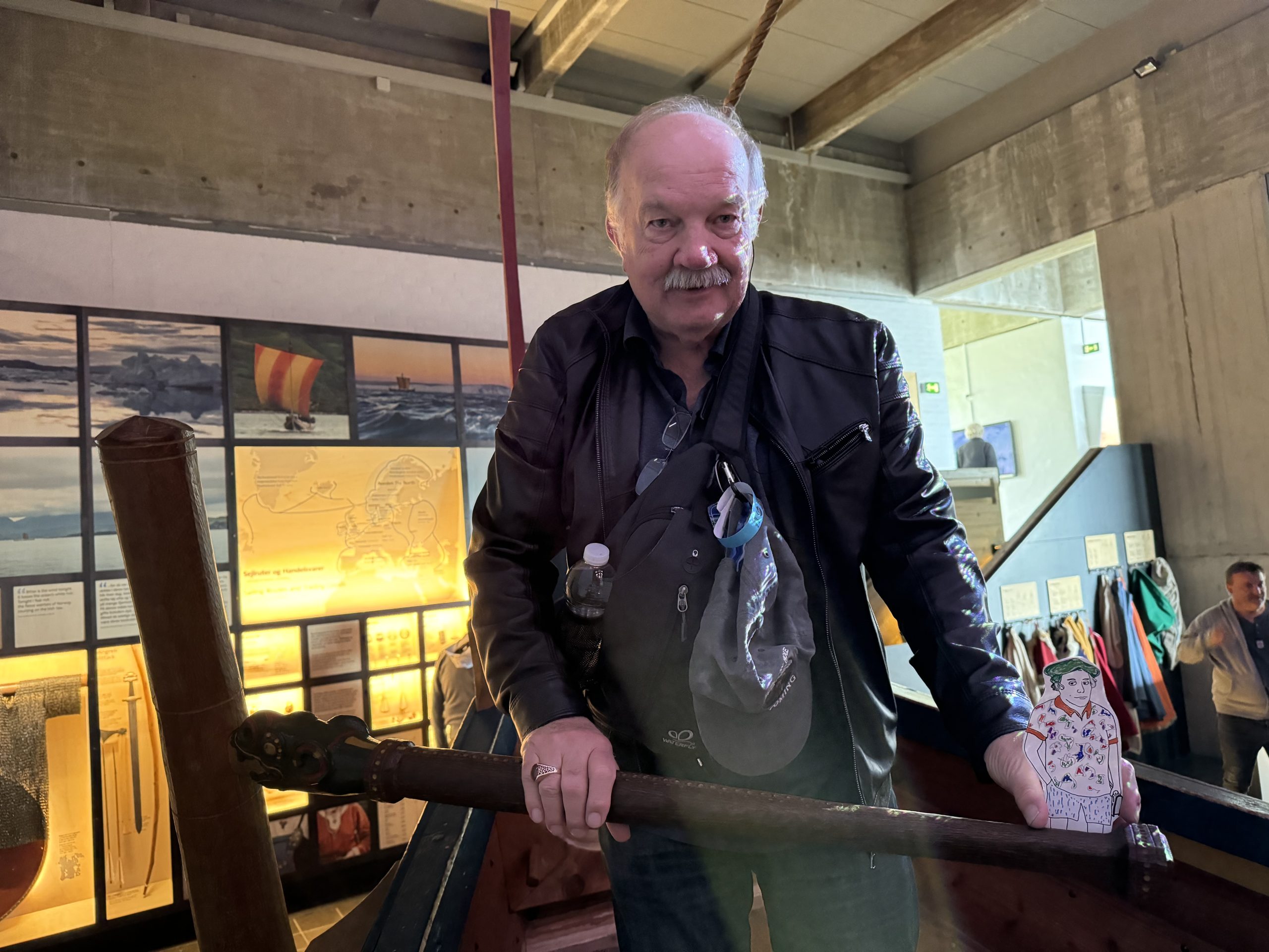 - Flat luther and Al Zipperle handling the rudder on a replica of a Viking longship at the Roskilde Viking Ship Museum in Denmark.