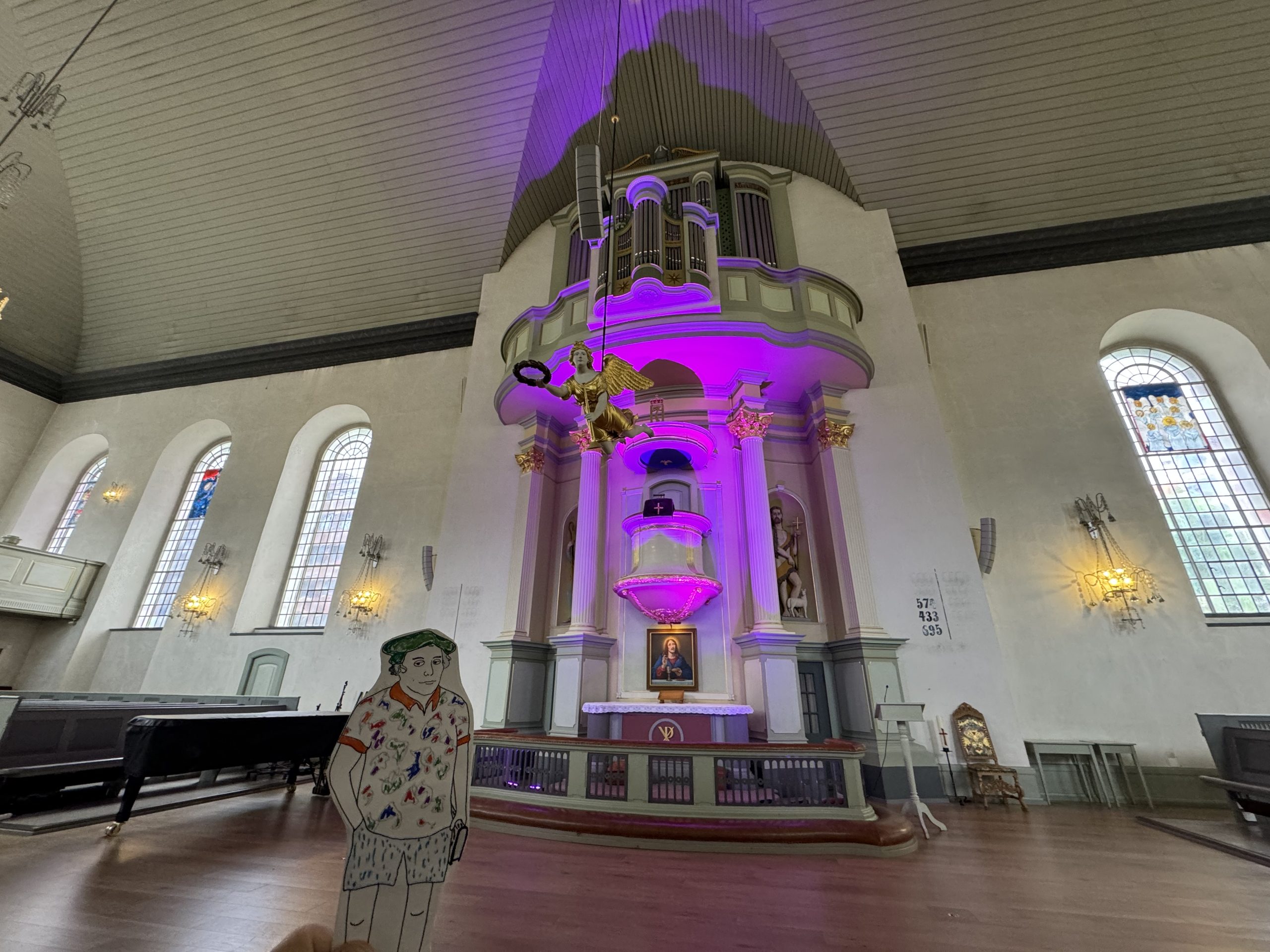 - Flat Luther visited a Lutheran Church in Bergen, Norway build in 1632 on top of the ruins of the former bishop’s palace from decades before. The Angel hanging from the ceiling was lowered and a bowl placed in the wreath for Baptisms. The composer Edvard Greig was baptized here.