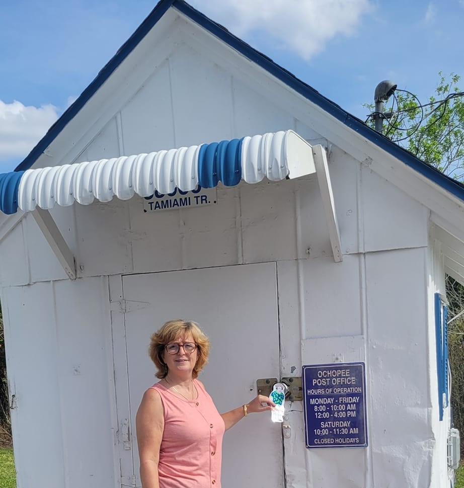 - Susan with Flat Luther at the smallest Post Office in the US (Ochopee)